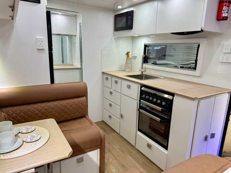 - Recessed 3 x gas and 1 x electric cooktop with full oven, grill, range hood and microwave